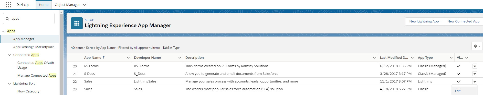 From the Setup Menu, navigate to Apps > App Manager. Select the application you would like to add the OpenCTI Softphone to. Click on the button on the far right of the record and select Edit.