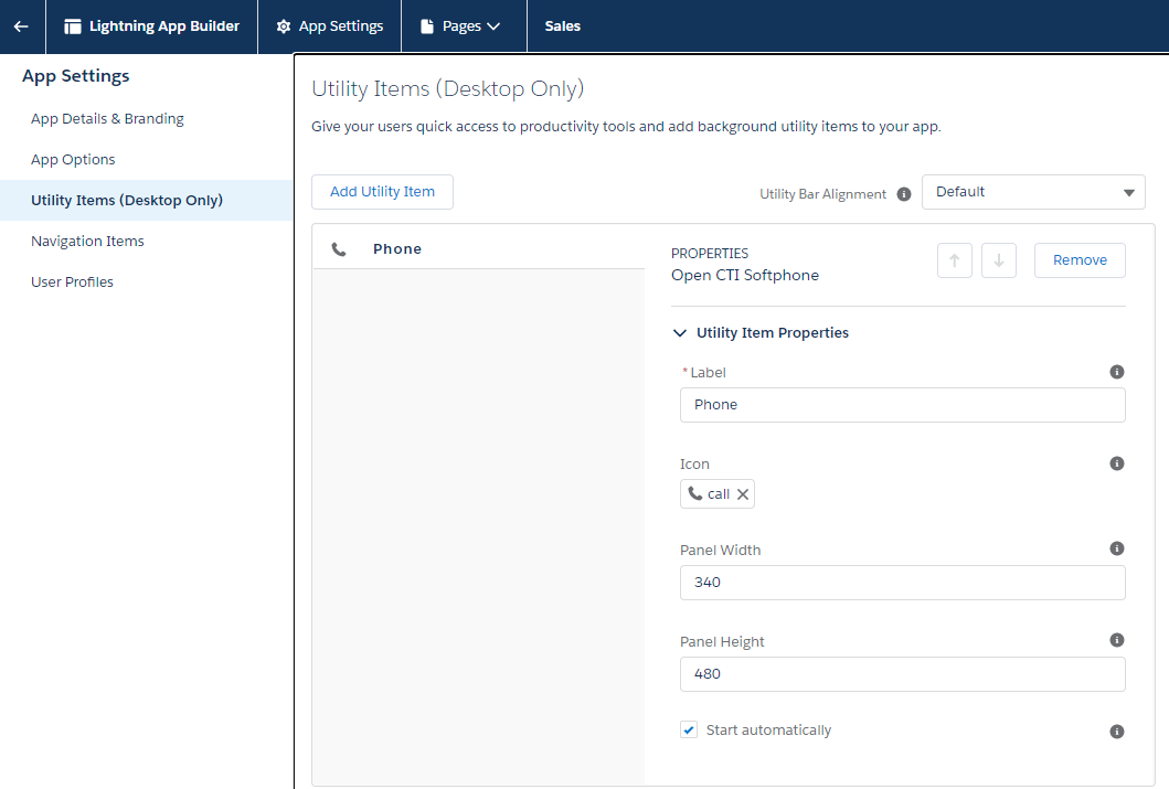 Once in edit mode, navigate to the Utility Items menu on the left. Select Add Utility Item and find the Open CTI Softphone.