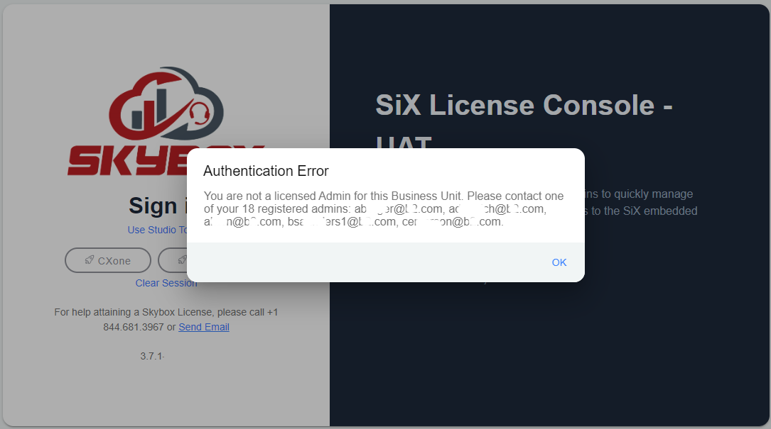 If your BU is already registered with Skybox, you will see an authorization error listing up to 5 already registered admins. Contact one of those admins to get access.