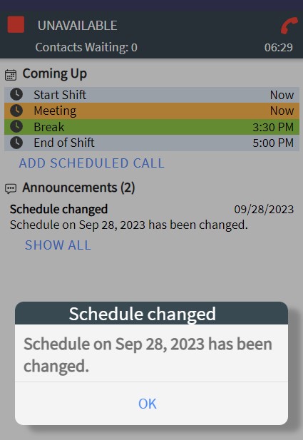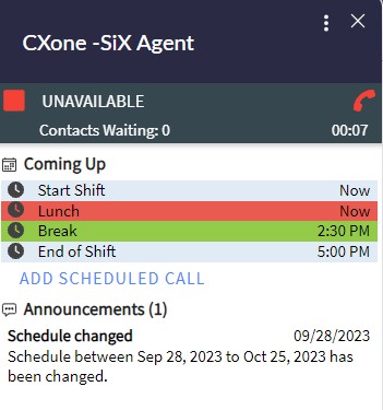 While logged into the SiX Agent, you can view your daily schedule directly within the interface. This helps you track upcoming breaks, lunches, and meetings.