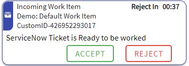 An agent has 45 seconds to accept an incoming work item. After 45 seconds or clicking REJECT, the work item is rejected and sent back into the same skill queue. The agent's state is changed to Refused.